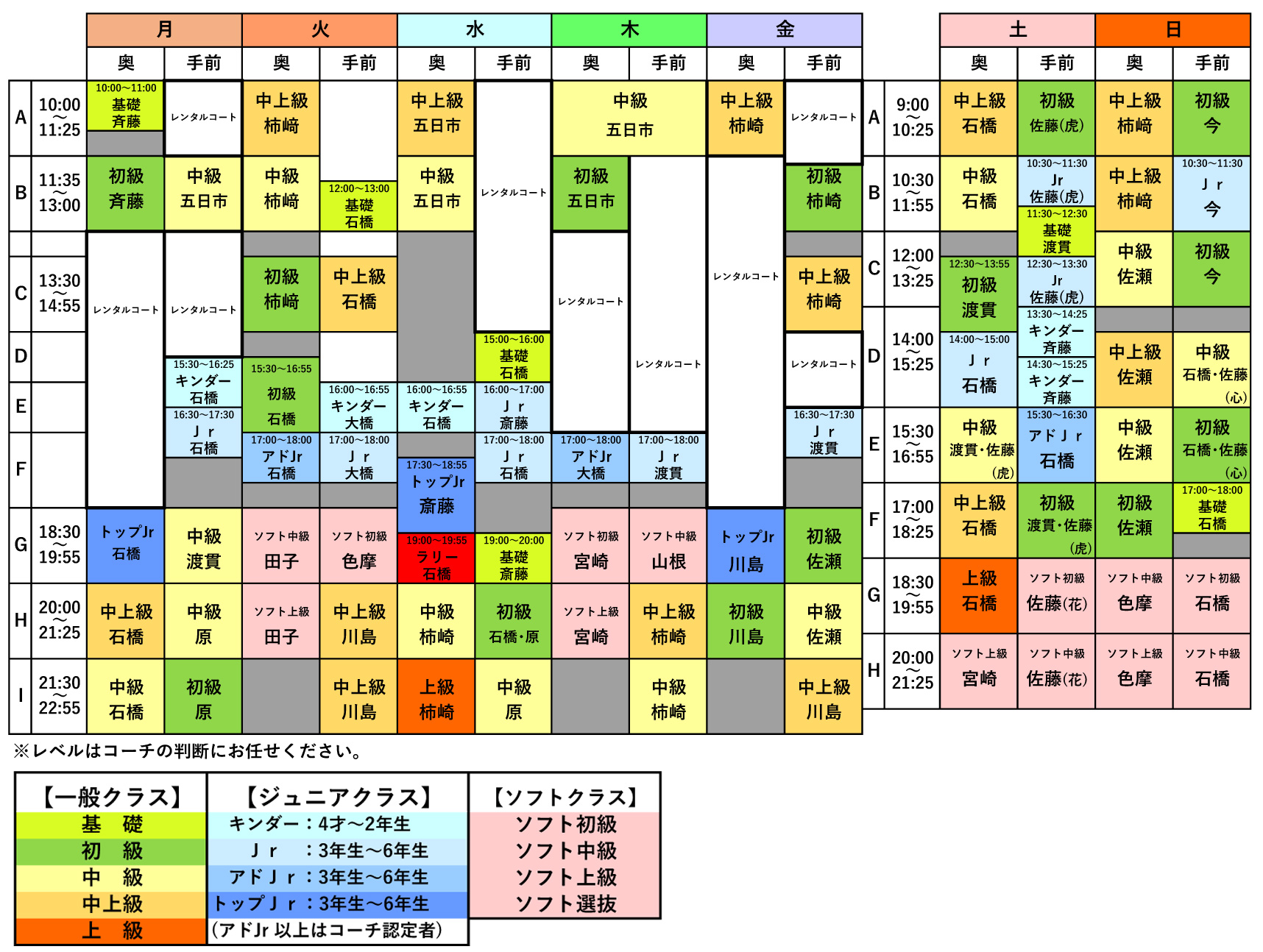 - *軟式クラス(ソフトテニスクラス)は、開始時間を30分遅らすことができます。(55分授業)